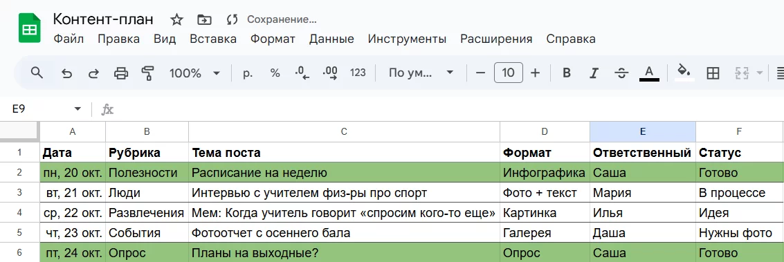 Контент-план — это основа вашей работы. Не держите идеи в голове, перенесите их в таблицу (пример ниже). Это поможет быть организованными и соблюдать регулярность публикаций.